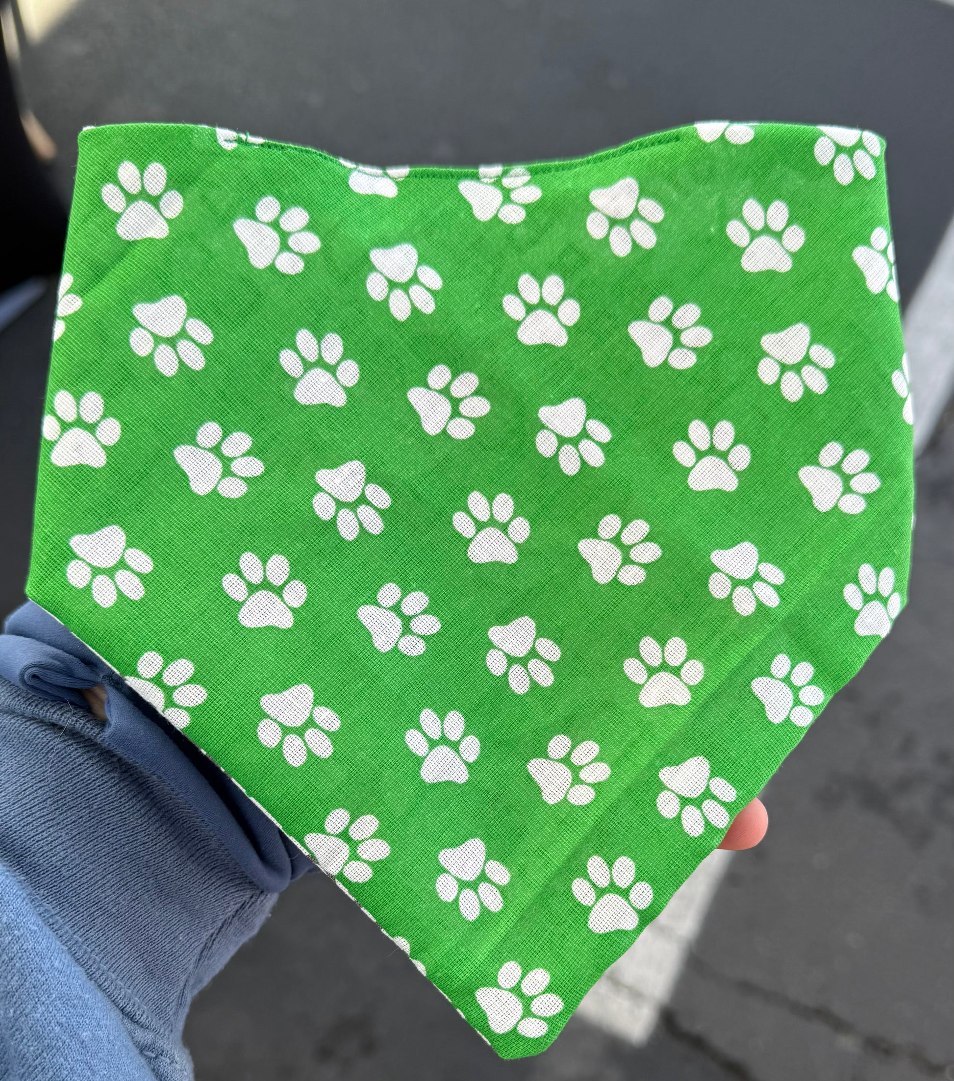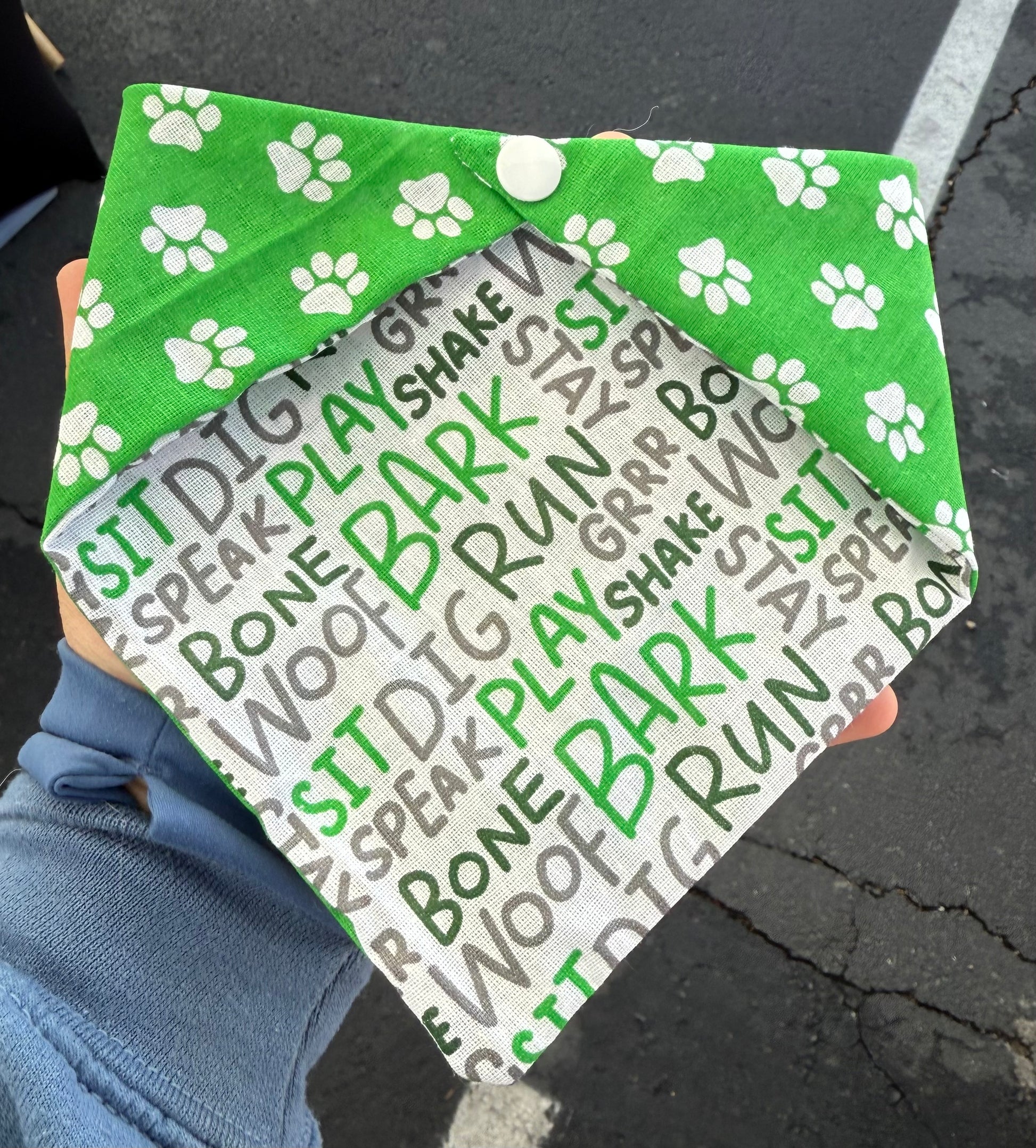 Enhance your pet's training experience with our reversible Spring Training bandana. One side features a playful green and white paw print design, while the other displays a wordle-style pattern of common training commands. Keep your furry companion looking stylish and ready to learn.